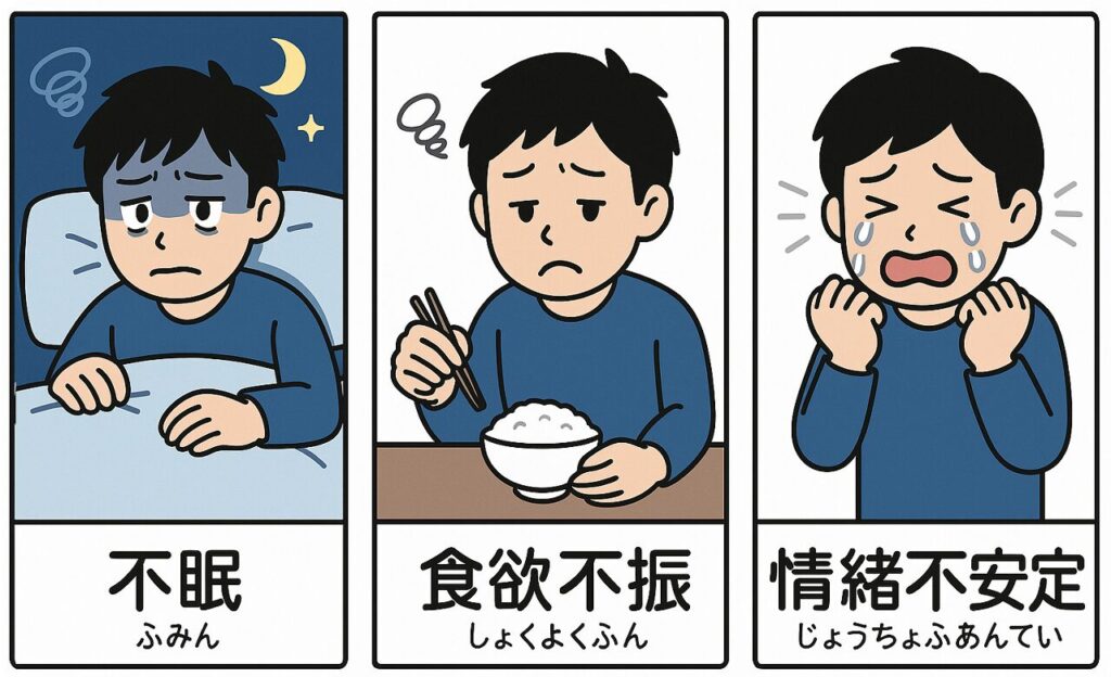 最近、こんな症状ありませんか?「眠れない日が続いている」「休日も仕事のことばかり考えてしまう」「体重が急に減った、または増えた」など。こういった変化が出ているなら、黄色信号です。辞める・辞めない以前に、まずは心身の健康を優先すべきサインかもしれません。