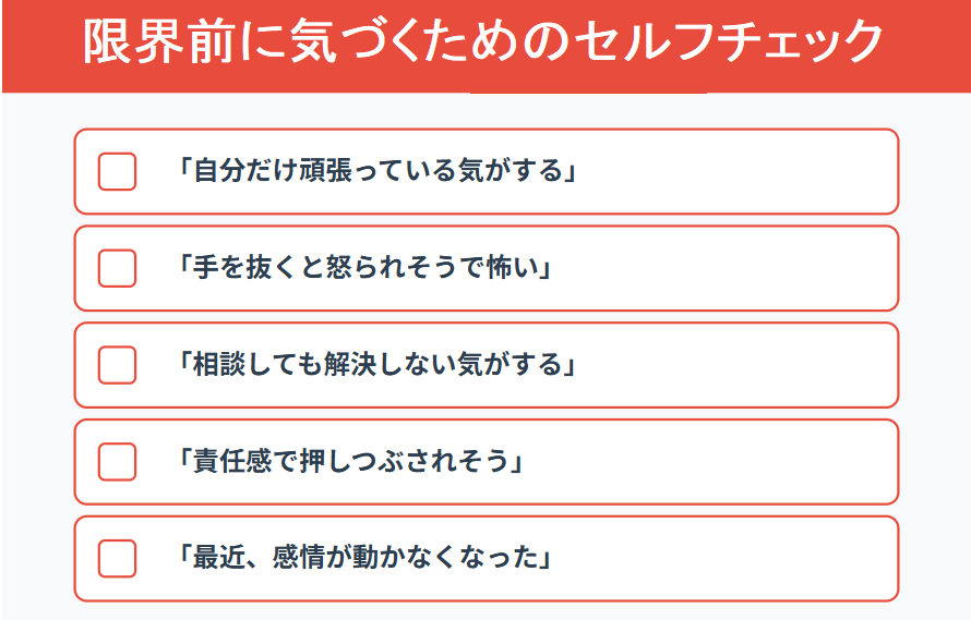 「もう少しだけ頑張ろう」「自分が辞めたら迷惑がかかる」と思い続け、心や体が限界を迎えるまでSOSを出さないのです。