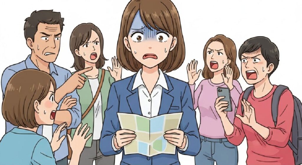 添乗員の仕事で精神的にきついと言われるもう一つの理由が「クレーム処理」と「現場でのトラブル対応」です。旅行という非日常の空間では、お客さんも期待が高まっている分、ちょっとしたミスや予定変更が大きな不満につながりやすいんです。
